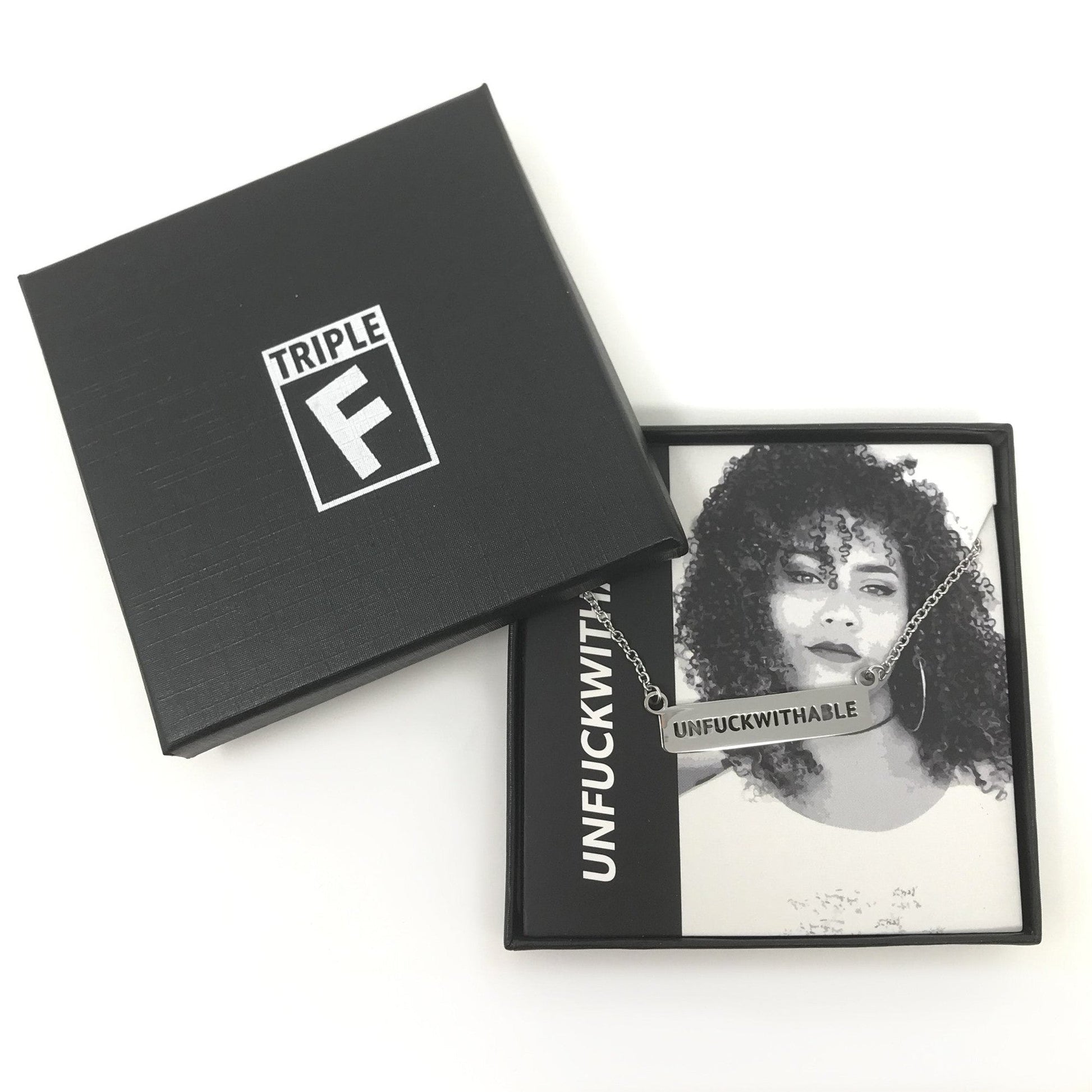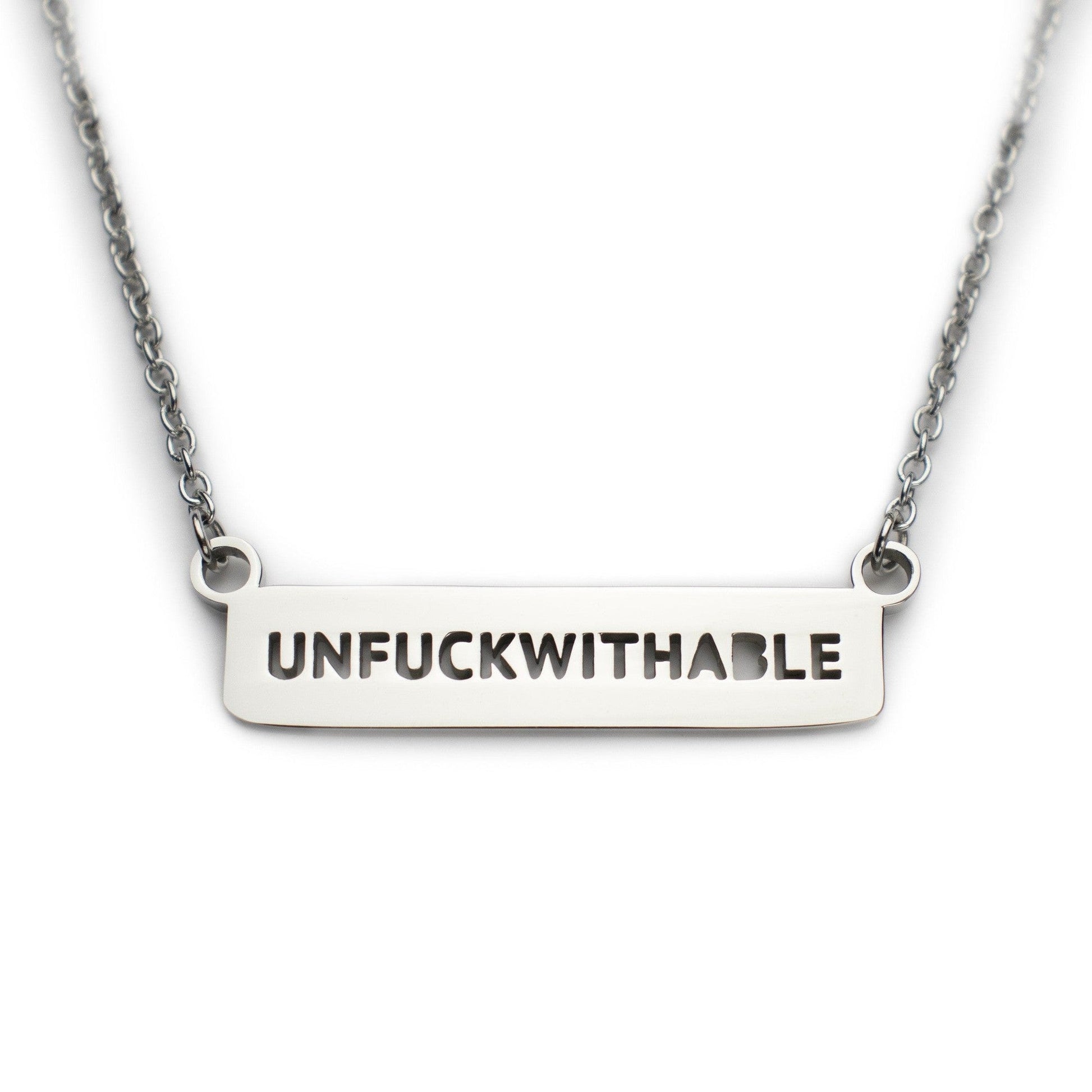 - Dainty bar laser cut-out reads UNFUCKWITHABLE